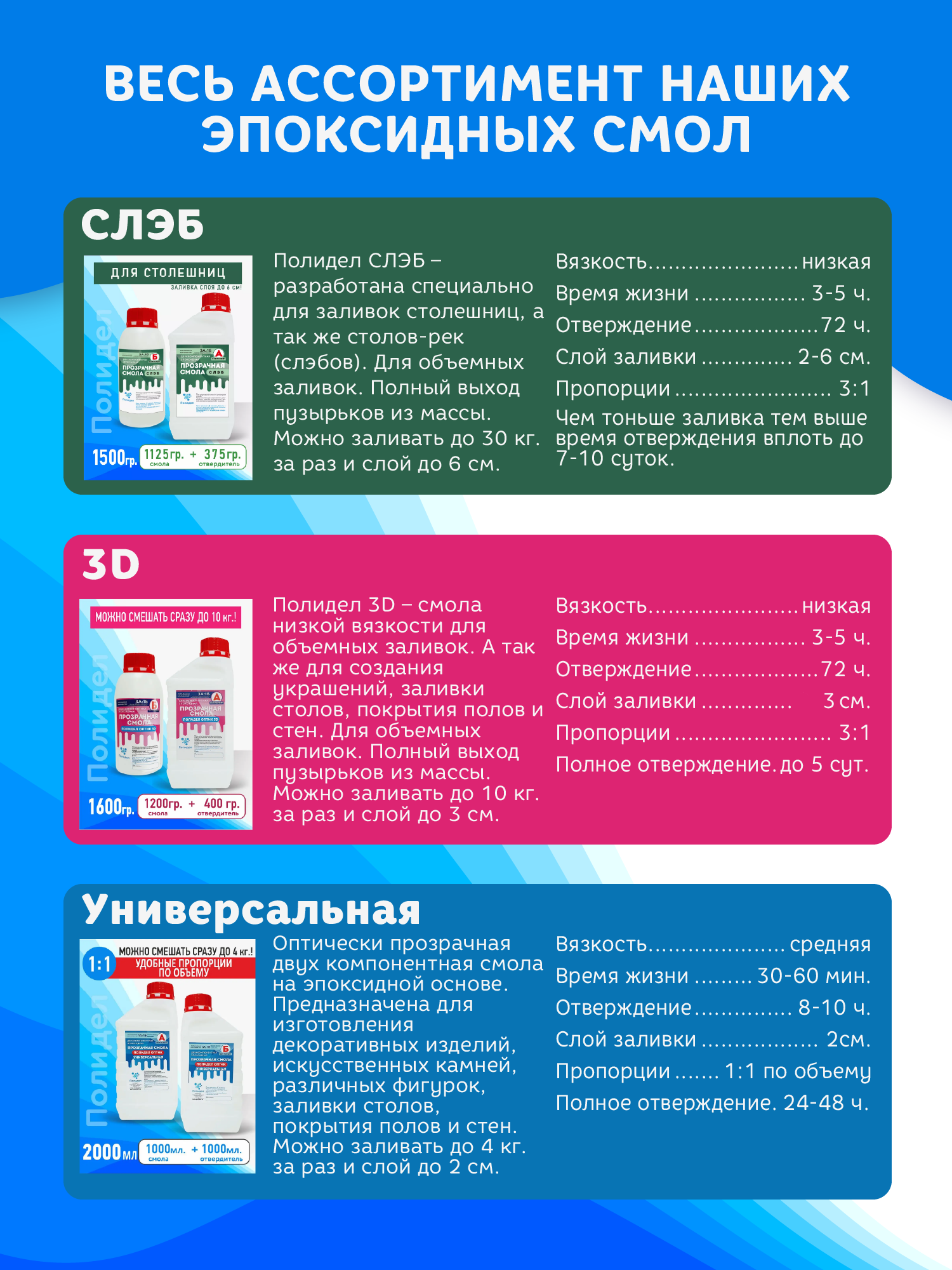 Эпоксидная густая смола от бренда Полидел разработана для воплощения любых Ваших творческих идей: рукоделия, создания ювелирных изделий, рисования картин, заливки столешниц, грунтования, декорирования, в качестве клея и лакового покрытия. Для хобби и творчество взрослых и детей. Её широко используют дизайнеры, ювелиры и творческие люди, интересующиеся в создании шедевров и декорировании пространства. Из прозрачной двухкомпонентной эпоксидки можно изготавливать изделия любого дизайна, например: кольца и браслеты, часы и подвески, кулон и серьги. А также предметы интерьера: скульптуры, светильники, объемные картины и столешницы из различных материалов, таких как дерево, металл и пластик. Поделки получаются настолько красивыми, они могут стать замечательным подарком для любимой жены или девушки, мужа, мамы дочери или сына и других близких на любой праздник: Новый год, День влюбленых 23 февраля или 8 марта или без повода. Набор состоит из двух компонентов: компонент А- эпоксидная смола и компонент В- отвердитель для эпоксидной смолы, в соотношении 2:1 (А:В) Рекомендуем замешивать не более 300гр за раз и заливать слой до 1 см за раз. Для замера пропорций компонентов обязательно используйте электронные весы. Идеально прозрачная и высокопрочная смола Premium качества. Художественная смола эпоксидная не содержит растворителей и не имеет резкого запаха поэтому с составом легко работать и ребенку и взрослому. Преимуществом смолы является ровное глянцевое покрытие, легко поддаётся полировке, устойчива к щелочи низкокислотным веществам. Смола подходит для любителей и профессионалов, но важно соблюдать меры предосторожности. Используйте одноразовые перчатки стаканчик палочки формочки. Идеальна в сочетании с красителями пигментами красками. После конечного отверждения возможна механическая абразивная обработка для придания необходимой формы изделиям. В нашем магазине Вы можете купить смолы, красители, жидкий пластик по акции в подарок со скидкой.